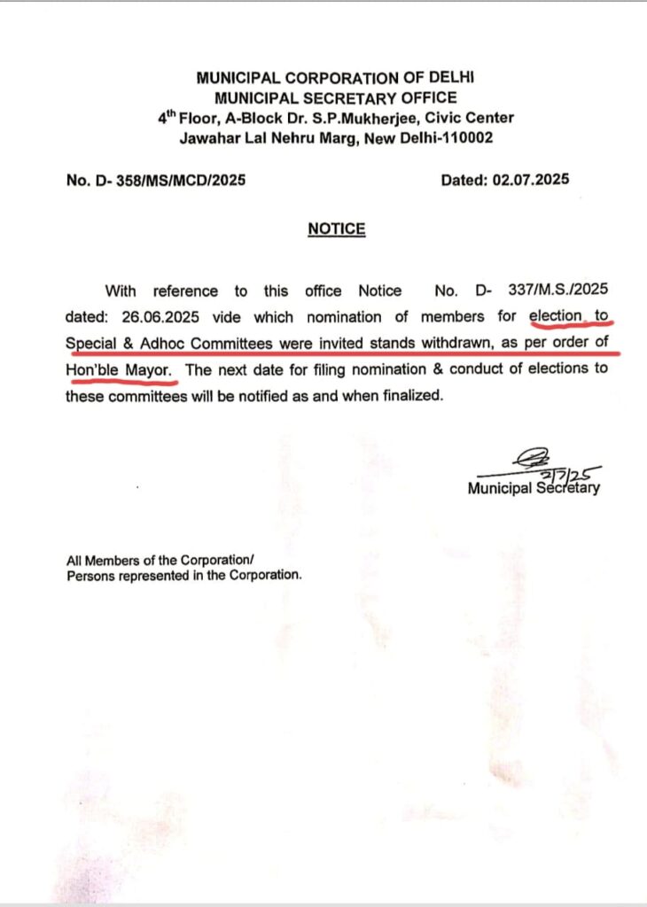 दिल्ली नगर निगम में विशेष (स्पेशल) और तदर्थ (एडहॉक) कमेटियों के गठन को लेकर एक बार फिर सियासत गरमा गई है। आम आदमी पार्टी नेमेयर राजा इकबाल सिंह पर गंभीर आरोप लगाते हुए कहा है कि भाजपा जनहित के मुद्दों से भाग रही है और लोकतंत्र को कमजोर कर रही है। पार्टी केनेता और एमसीडी में नेता प्रतिपक्ष अंकुश नारंग ने प्रेस वार्ता कर कहा कि भाजपा केवल सत्ता का सुख चाहती है, उसे दिल्ली की जनता की कोईपरवाह नहीं है।उन्होंने कहा कि विशेष और एडहॉक कमेटियों के चुनाव के लिए 3 जुलाई तक नामांकन की प्रक्रिया चलनी थी, लेकिन मेयर नेअचानक 2 जुलाई को पत्र संख्या 358/MS/MCD/2025 के ज़रिए चुनाव को अनिश्चितकाल के लिए टाल दिया। यह निर्णय दर्शाता है कि मेयरसिर्फ एमसीडी की पूरी शक्तियां अपने पास रखना चाहते हैं और किसी अन्य जनप्रतिनिधि को अधिकार देना नहीं चाहते।
