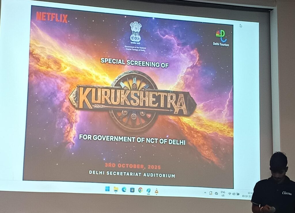 दिल्ली सचिवालय में आज एक आयोजन हुआ, जिसमें महाभारत और गीता पर आधारित ‘कुरुक्षेत्र’ एनिमेटेड श्रृंखला की खास स्क्रीनिंग आयोजित कीगई। यह श्रृंखला शीघ्र ही विश्व प्रसिद्ध ओटीटी मंच नेटफ्लिक्स पर प्रसारित की जाएगी। इस अवसर पर दिल्ली सरकार के कला, संस्कृति एवं भाषातथा पर्यटन मंत्री श्री कपिल मिश्रा मुख्य अतिथि के रूप में उपस्थित रहे। उनके साथ दिल्ली पर्यटन सचिव एवं डीटीटीडीसी की प्रबंध निदेशक श्रीमतीनिहारिका राय तथा नेटफ्लिक्स की पब्लिक पॉलिसी निदेशक सुश्री महिमा कौल भी मौजूद रहीं। इस विशेष कार्यक्रम में दिल्ली कॉलेज ऑफ आर्ट्सके अनेक छात्र-छात्राओं के साथ-साथ सचिवालय के वरिष्ठ अधिकारियों और विशिष्ट अतिथियों ने भी भाग लिया। सभी ने उत्साहपूर्वक इस नईश्रृंखला के प्रदर्शन को देखा और भारतीय संस्कृति से जुड़े इस अनूठे प्रयास की सराहना की।