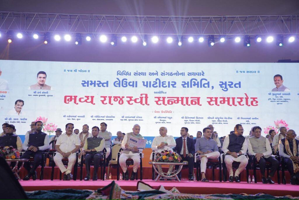 ગુજરાત પ્રદેશ ભાજપા મીડિયા વિભાગની અખબારી યાદી જણાવે છે કે, સમસ્ત લેઉવા પાટીદાર સમિતિ, સુરત દ્વારા મોટા વરાછા ખાતે મુખ્યમંત્રીશ્રી ભુપેન્દ્રભાઇ પટેલ, ભાજપા પ્રદેશ અધ્યક્ષશ્રી જગદીશભાઇ વિશ્વકર્મા, નાયબ મુખ્યમંત્રીશ્રી હર્ષભાઇ સંઘવીની ઉપસ્થિતિમાં રાજય સરકારના વિવિઘ મંત્રીશ્રીઓનો તેમજ ભાજપાના નવનિયુકત પ્રદેશ પદાધિકારીશ્રીઓનો સન્માન સમારોહ યોજાયો હતો. આ કાર્યક્રમમાં કેન્દ્રિય મંત્રીશ્રીઓ શ્રી મનસુખભાઇ માંડવિયા અને શ્રી સી.આર.પાટીલ વિશેષ ઉપસ્થિત રહ્યા હતા.